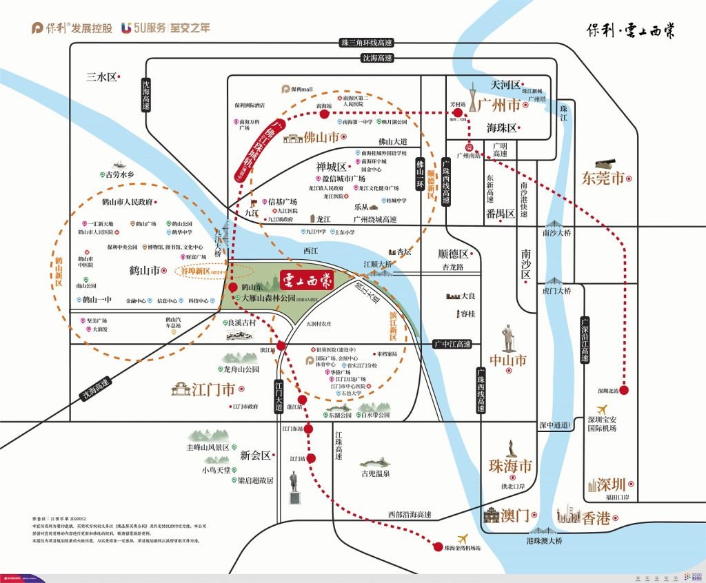 【交通配套】一軌二橋三路 暢享廣佛江同城一小時生活圈 【一軌】2025年將在項目距離15分鐘車程開建造廣佛江珠城軌鶴山東站,建成後到廣州將縮短到30分鐘,1小時到達珠海站,暢享1小時珠三角核心城市圈。【兩橋】小鎮周邊已建好兩座快速大橋——九江、江順大橋,連接佛山南海及順德,半小時即可到達佛山兩區。【三道】東側入口就是雙向8車道的濱江大道時速可達到80公里,20分鐘到達濱江新區,30分鐘到達萬達商圈。佛開高速大雁山出口通高速,40分鐘可到佛山核心千燈湖、1小時可到廣州珠江新城;通過南側的江門大道,全程基本無紅綠燈,1個半小時到達珠海拱北口岸,無縫接駁港珠澳大橋。